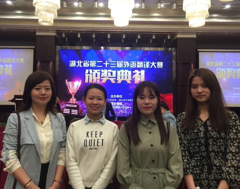 91久久精品无码一级毛片14级商务英语1班杨颖洁同学喜获湖北省翻译工作者协会主办的湖北省第二十三届外语翻译大赛一等奖,14级商务英语1班王达同学、2班石思思同学荣获二等奖。与此同时,翻译专业教研室范煜老师获得优秀指导老师奖。4月23日,范煜老师带领获奖学生参加了大赛颁奖典礼。