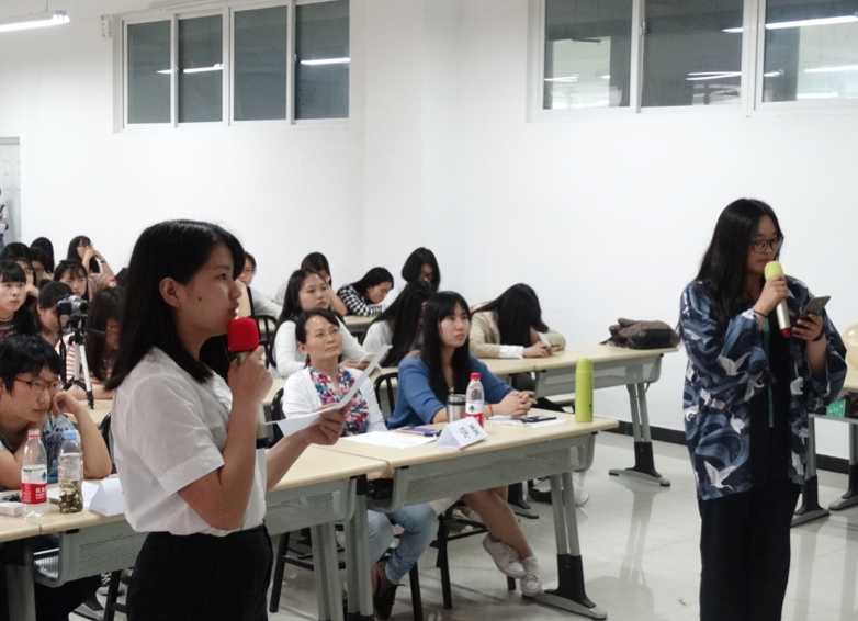 第二个环节,英语组参赛选手分别为三段脱口秀作情景配音,日语组参赛选手分组为日剧《女王的教室》片段配音,比赛难度较之第一轮更甚一筹。然而大家都是有备而来,面对极快的荧幕语速和主人公变化较大的情感特征,参赛选手们淡定自若、收放自如地完成了各自的表演,真是让人感受到他们功夫之深,能力之强。此次比赛的圆满举办,于选手们,既得到了奖证的鼓励,又和同学切磋了技术;于台下的观众们,不仅感受到语音语调的美感所在,又能通过选手们的表现学习到发音的技巧。