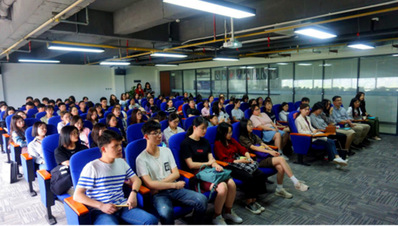 在互动环节,我院学生积极与企业工作人员展开互动,并就所关心和感兴趣的话题同该企业有关人员进行了深入探讨,例如,跨境电商行业对毕业生的综合能力要求、外语水平要求、跨境电商行业职业发展道路等。随后,张助理介绍了弗睿公司的发展历程、业务经营范围和未来发展愿景,邀请公司新入职员工分享职业心得体会。最后,张助理鼓励大家在学好英语的前提下要胸怀天下,及时关注国家的政策方针经济发展动态,并热情邀请在座的学生将来到弗睿公司实习或工作。