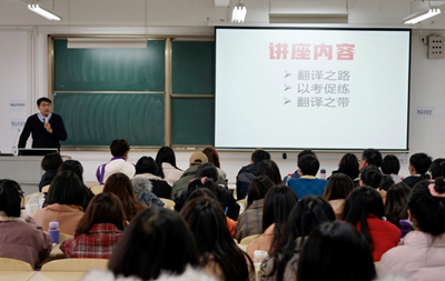 进入到“以考促练”的部分,姜涛教师向同学们详细展示了如何通过各类外语类考试和竞赛来提升学习能力。以考研为例,学生在不同阶段需要有针对性的复习,同时要注意综合能力的提升。姜涛教师也根据多年的口译教学经验分享了口笔译考生常见的问题和对策。随后,在“翻译之带”的环节,姜涛教师通过一系列的翻译练习和讲解,让大家在实战中加深了对翻译原则和策略的理解。姜涛老师风趣幽默的语言风格和深厚的翻译功力深受大家的喜爱。同学们积极参与互动,现场氛围十分活跃。