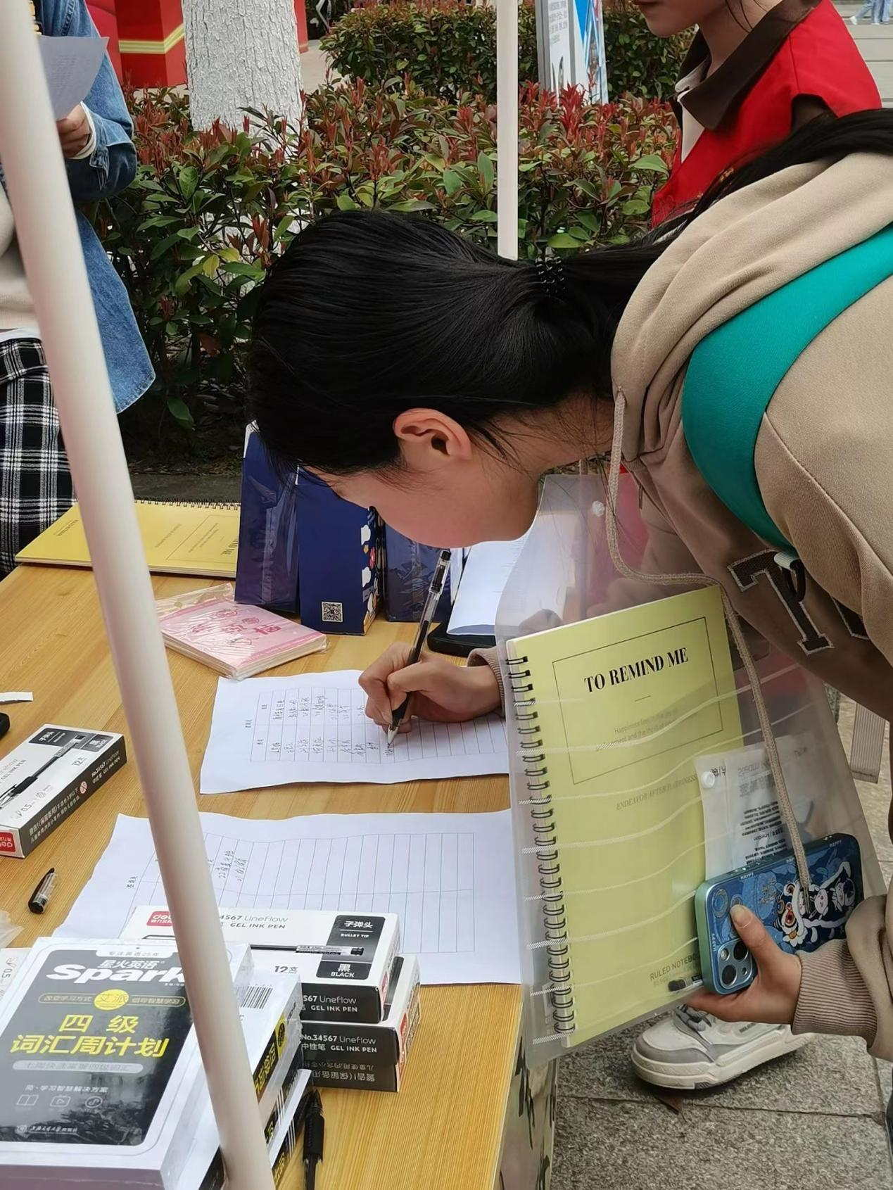 在本次活动期间每个时间段各由9位志愿者在现场组织摆点活动,活动规则为三分钟内根据中英单词对照表记忆单词,现场根据同学们记下的单词数量正确率设有一等奖,二等奖,三等奖以及参与奖。在两天的活动过程中有不少同学积极参与,每个参与的同学都向我们体现了他们努力的一面,而志愿者们也在鼓励他们大胆尝试,并积极引导他们参加活动,此次参赛的同学们通过这种活动方式感受到了单词记忆的乐趣,收获自己努力后得到的快乐,而志愿者们也能够通过帮助他人体会到雷锋精神在我们日常生活中带给我们的意义。