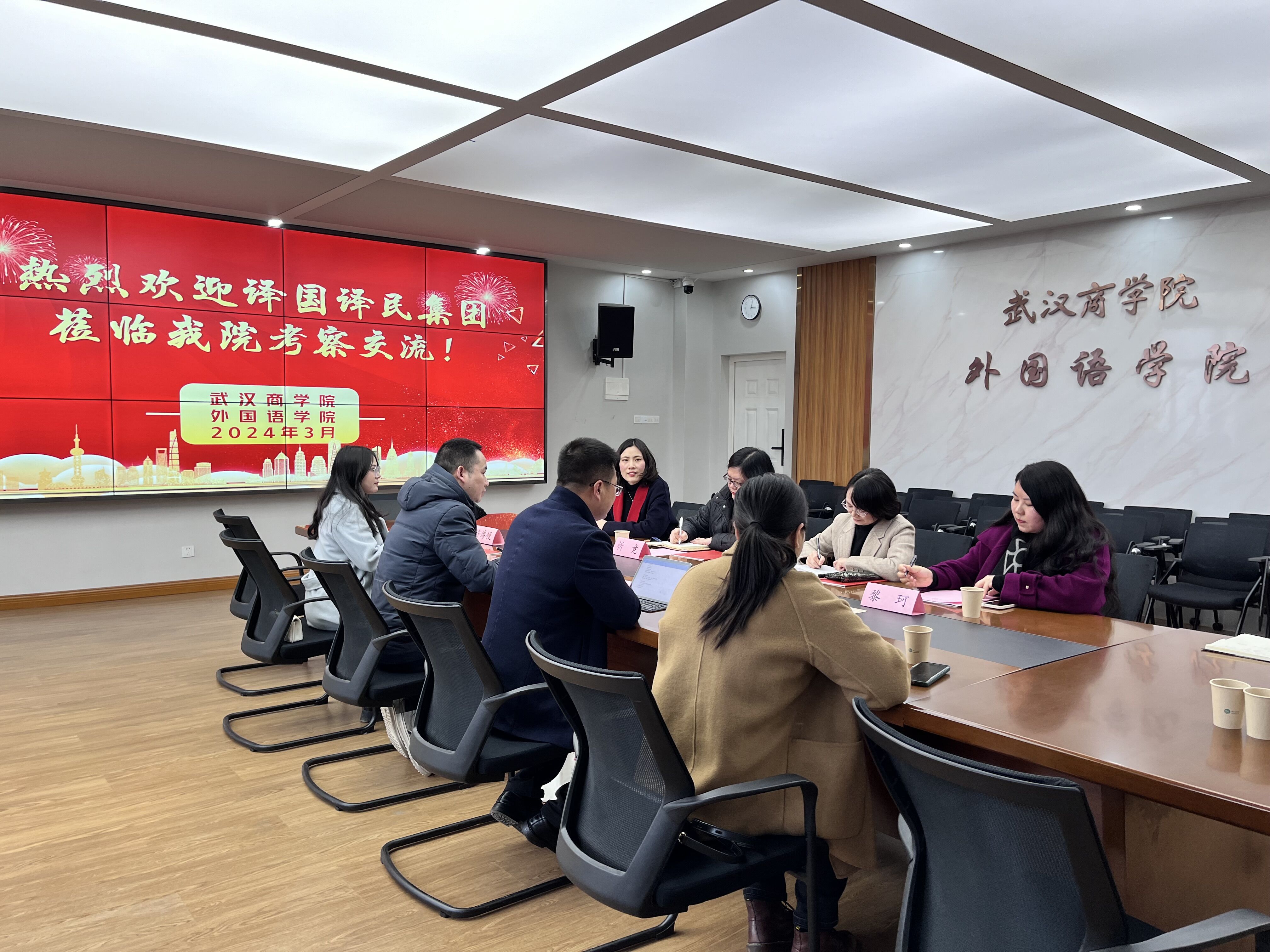 2024年3月5日下午,译国译民集团董事长林世宋、武汉公司总经理傅立松一行4人莅临我院洽谈校企深度合作事宜,91久久精品无码一级毛片院长李萍、副院长忻竞、翻译系主任黎珂及副主任喻娟参加洽谈。